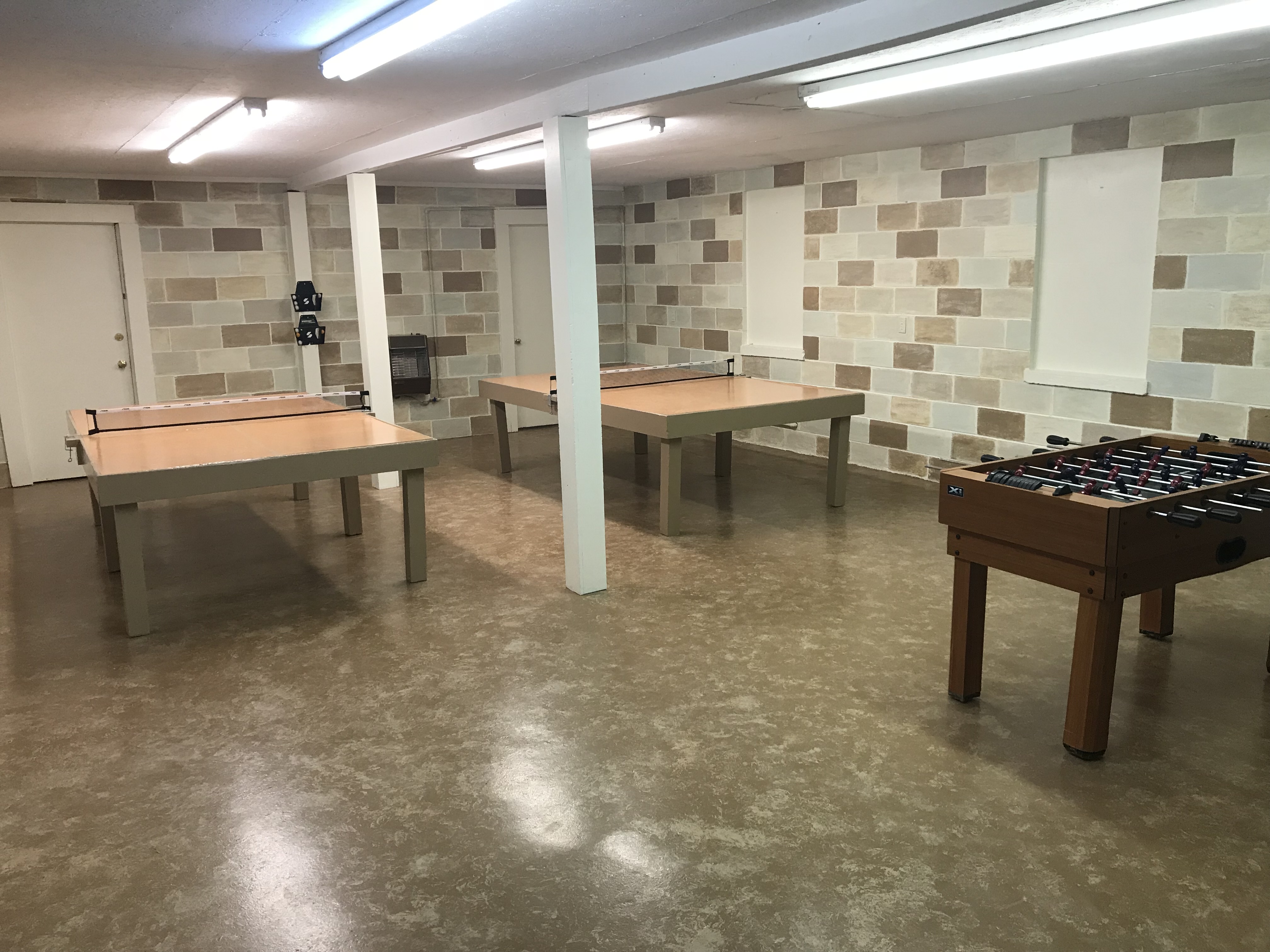 Located off the dining room, our game room offers ping-pong tables, a foosball table, a tv and dvd player, and numerous board games. Groups enjoy setting up a snack bar atop our slide-top chest cooler. This is a great room for hanging out or for small group sessions.
